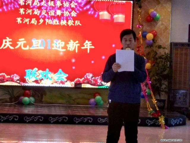 联欢会上演绎了精彩的好节目,美丽的扇子舞“今天是你的生日我的中国”拉开了序幕,上演的节目种类很多,舞蹈类有:舞蹈(北京的金山上)、(来生愿做一朵莲)(红马鞍)(爱从草原来)交谊舞:(串烧)、(中三步)、(二套水兵舞)、(水兵舞慢四)、(自由舞)太极舞(化蝶)扇子舞(吉祥中国年)太极拳类有:简化24式、32式、42式、新编36式、杨式37式、40式,陈式太极拳花样,陈式精要18式太极拳,83式片断,太乙太极拳,佛拳等,器械类有:太极功夫扇,太极养生扇,32式太极剑,44式太极刀,太极组合:抖空竹、云水扇、混元太极拳、段位拳对打、36式太极刀、24式太极剑、太极对练对扇等,年会在扇子舞“开门红迎新年”的歌舞中落下了帷幕。大家表演的非常的认真,掌声不断,友邻协会进行了拳技表演,深受苇河局朋友和拳友的尊重与爱戴。这次活动广播电视局两名记者进行了全程录制并且对有关人员进行了现场专访,对这次年会和联欢会是一种关怀,对参加这次活动的所有人员是极大的鼓舞和鞭策。