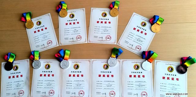 十二枚奖牌中,杨爱国教练的男子E组42式太极剑以9.15分获得了第一名的战绩;他的42式太极拳以9分获得了第五名的好成绩。两枚金牌,双一等奖晋级全国决赛。
