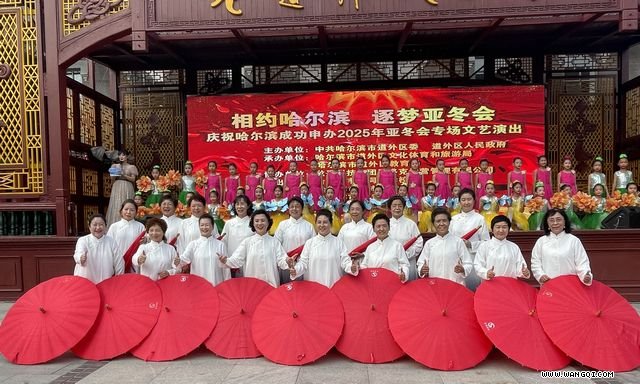 展演活动在热烈的掌声中开始,拳友们兴致勃勃地表演着各式太极拳套路和太极器械,哈尔滨市武苑研教中心永年太极拳研究会也来助阵演出。下午4点钟,主会场舞台的大屏幕亮起来了,宣布哈尔滨市申办2025年第九届亚洲冬季运动会获得成功的消息。广场沸腾了,舞台上下人们欢呼雀跃,舞台上轮番表演着各式精彩节目,哈尔滨市太极拳协会表演队的部分拳友表演了太极器械--太极伞,以太极拳人弘扬中国传统太极文化的独特方式热烈庆祝哈尔滨市申办2025年第九届亚洲冬季运动会成功。