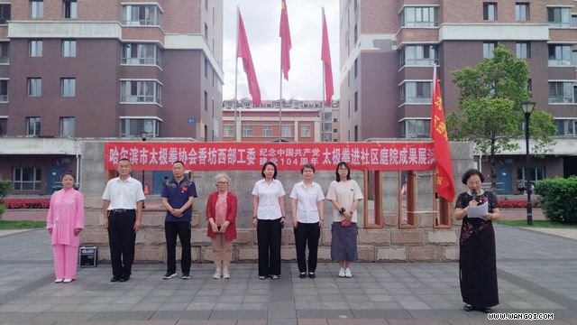 7月1日上午9时,哈尔滨市太极拳协会香坊区西部工委在香坊区建筑街道办事处林园社区黑大芳洲园小区,举行了“庆祝中国共产党建党104周年 太极拳进社区庭院成果展演”活动。哈尔滨市太极拳协会会长曹德贵,香坊区西部工委主任姜忠范、党小组长王淑坤、副主任王继娟,香坊区建筑街道办事处娄晶主任、王芳委员,林园社区工作人员郭丹、赵雪、李晗、郭蕾、刘春梅等以及香坊区西部工委各辅导站170多名老师和拳友参加了活动。