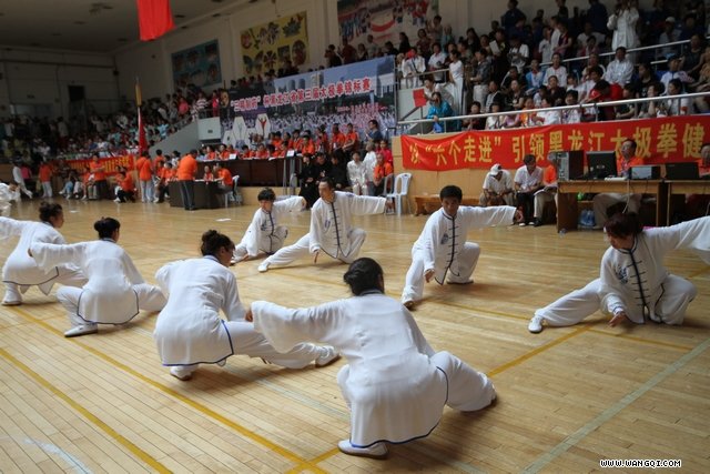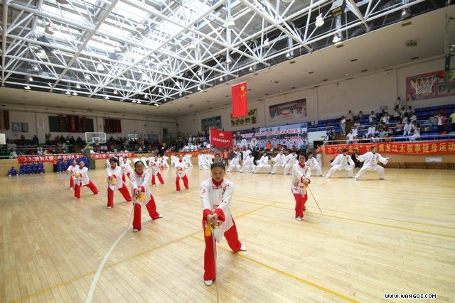 哈尔滨市人民体育馆内,布置得庄重、大气、简洁、喜庆,充满了隆重、热烈、祥和的气氛。大幅的喷涂彩绘背板上,省太极拳协会组织的太极拳演练大场景画面衬托着“三精制药”杯黑龙江省第三届太极拳锦标赛的会标直入眼帘,四位太极运动健儿的精彩亮相引人夺目;主席台对面两侧悬挂的“弘扬太极精神,彰显太极快乐,为筑建和谐健康黑龙江作贡献”等横幅标语格外醒目,大庆油田、大庆油田电力集团及其采油厂、双城太极拳协会和弘武太极拳协会等单位在会场四周悬挂的祝贺条幅为大会增添了喜庆气氛。