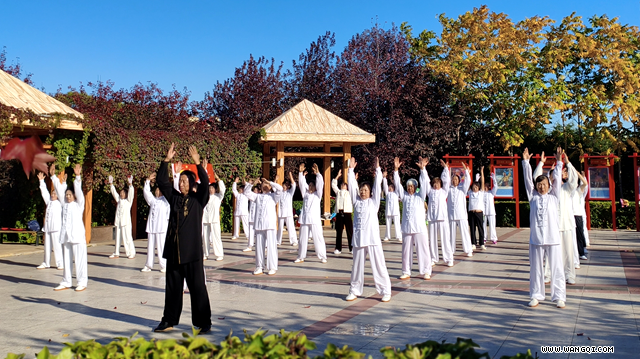 小桥上,漫抻腰。腾挪太极任逍遥。