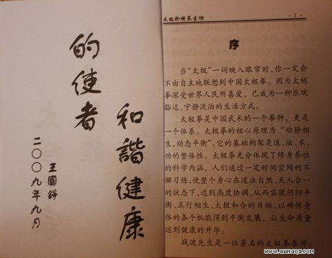 上图和下图为哈市残联理事长王国铮为该书题词和哈市太极拳协会会长杨义龙为该市作序。