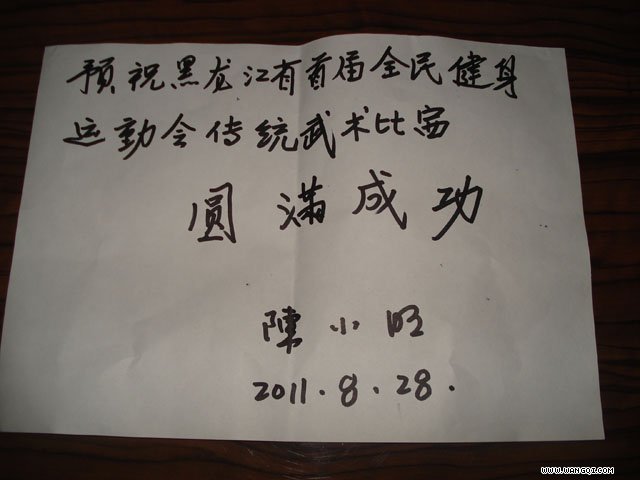 在安达市培训期间,应绥化市体育局副局长、市体育总会主席,绥化市武术协会名誉主席潘跃喜之邀,陈小旺大师欣然命笔,为即将在绥化市举办的黑龙江省首届全民健身运动会传统武术比赛题辞:“预祝黑龙江省首届全民健身运动会传统武术比赛圆满成功”。这是当代著名武术家对龙江广大武术爱好者的厚望和期盼,更是我们创新发展地方武术事业、打造绥化“关东武术之乡”的宝贵财富。
