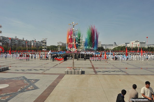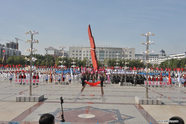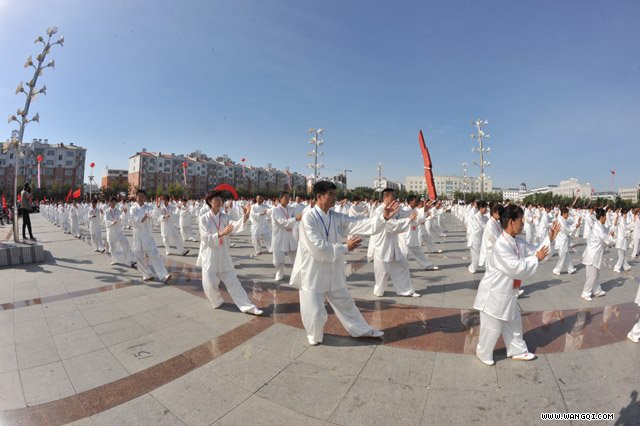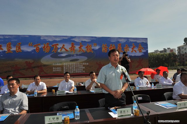 本网建三江9月8日讯 今天,建三江人民广场彩旗招展,人头攒动,由总局文化委、北大荒太极拳运动协会主办,建三江管理局承办的“百场万人舞太极”活动展暨北大荒“伍峰杯”太极拳比赛在这里拉开帷幕。省体育局党组书记、局长郭铭玉宣布大会开幕,总局党委副书记李涛出席开幕式并讲话。