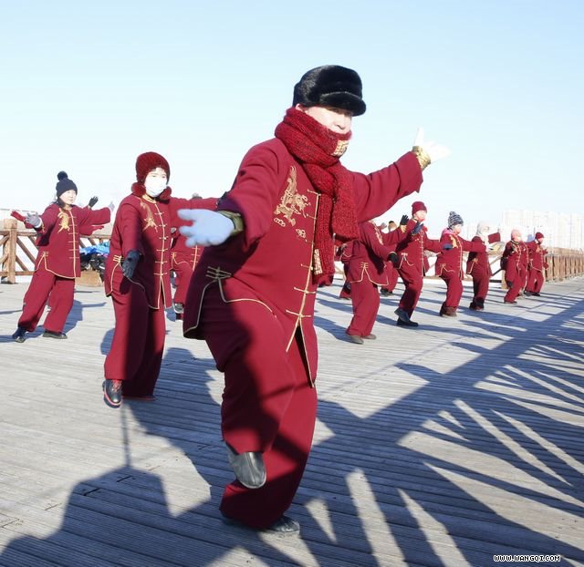 一位位身着紫红色太极服的大庆太极人,精神抖擞,动作整齐划一,刚柔相济,潇洒飘逸。48名陈氏太极拳习练者在大庆市太极拳协会副主席徐彦峰的带领下,在黎明湖龙舟冰雪乐园园内场地和黎明湖栈桥之上,演练陈式太极拳精炼26式。