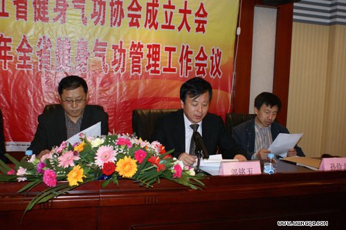 上图为出席黑龙江省健身气功协会成立大会的领导同志有:省委防范办主任张金峰(左二),省体育局局长郭铭玉(右二),省体育局副局长李峰(左一)。