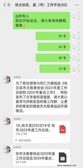 12月7日,哈尔滨市太极拳协会利用网络平台,召开了2023年度工作总结线上会议。出席会议的领导有黑龙江省太极拳协会会长鲁仲平,黑龙江省、哈尔滨市太极拳协会名誉副会长王忠义,哈市协会会长曹德贵、常务副会长张春凤,参加会议的人员还有市协会各区工委主任、副主任和县(市)协会会长、秘书长以及协会秘书处驻会工作人员,会议由市协会副会长兼秘书长杨文洋主持。