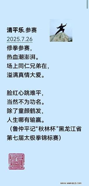 8:30,600名运动员代表整齐列队,接受裁判员检阅入场。开幕式上,黑龙江省太极拳协会会长鲁仲平同志致开幕词。他的致词热情又富有诗意,还即兴赋诗《清平乐·参赛》:“修拳参赛,热血心澎湃。场上同仁兄弟在,溢满真情大爱。脸红心跳难平,当然不为功名。除了童颜鹤发,人生哪有输赢。”赢得现场阵阵掌声。