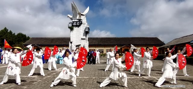鸽岛广场上杨式28式太极扇和24式简化太极拳的集体表演场面壮观,太极旋转大舞台的推手表演轻柔中带着千钧之力,山庄荷花节舞台的拳剑刀扇表演精彩连连。