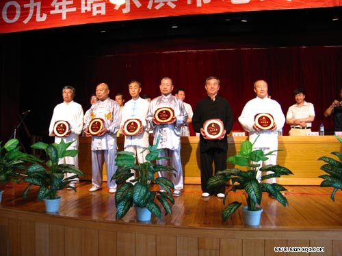 哈尔滨市体育总会于2009年7月8日隆重举行35位老武术家授牌仪式,市太极拳协会王培昌和战波两位著名拳师榜上有名。图为王培昌(前排左二)和战波(前排右一)在授牌仪式上。