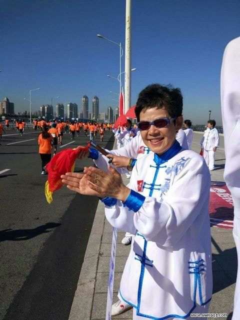 “中国太极功夫扇”汲取了中华传统武术精华,将扇子挥舞与太极运动技巧灵活结合。“中国太极功夫扇”与《中国功夫》旋律的巧妙结合,使人赏心悦目,精神振奋。胜利完成“哈马”鸣枪航拍任务后,意犹未尽的拳友们,放下手中的太极扇,又精神抖擞地打起了太极拳。拳友们除了在防洪纪念塔广场表演外,还在友谊西路、赛场折返点处同时进行系列节目表演,一外国迷你马拉松队员被中国太极功夫深深吸引,主动加入太极拳展示队伍。太极拳表演者们,良好地诠释了中华优秀传统文化魅力,他们以独特的风姿,冰城太极人的时代风采,为哈马加油助威!